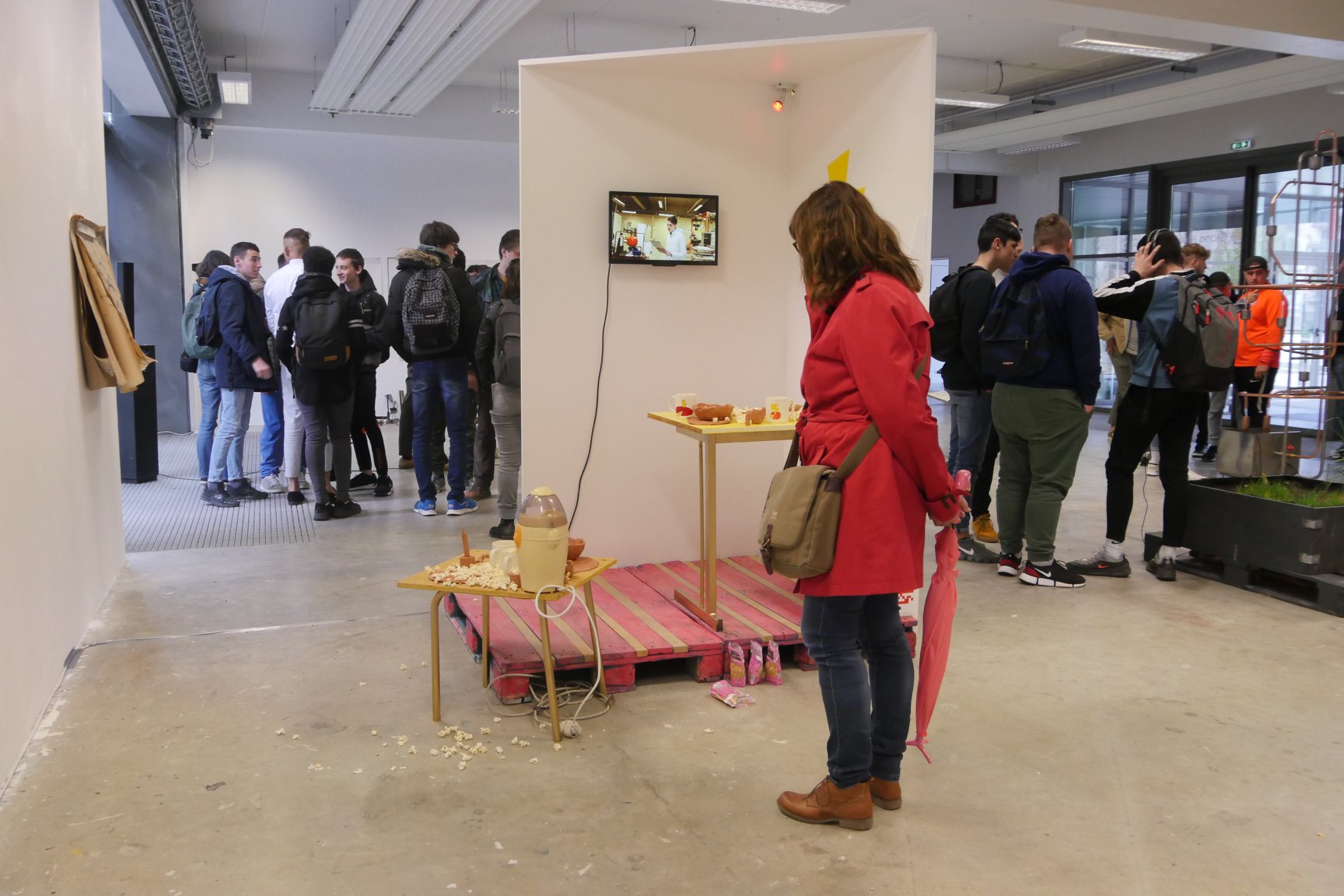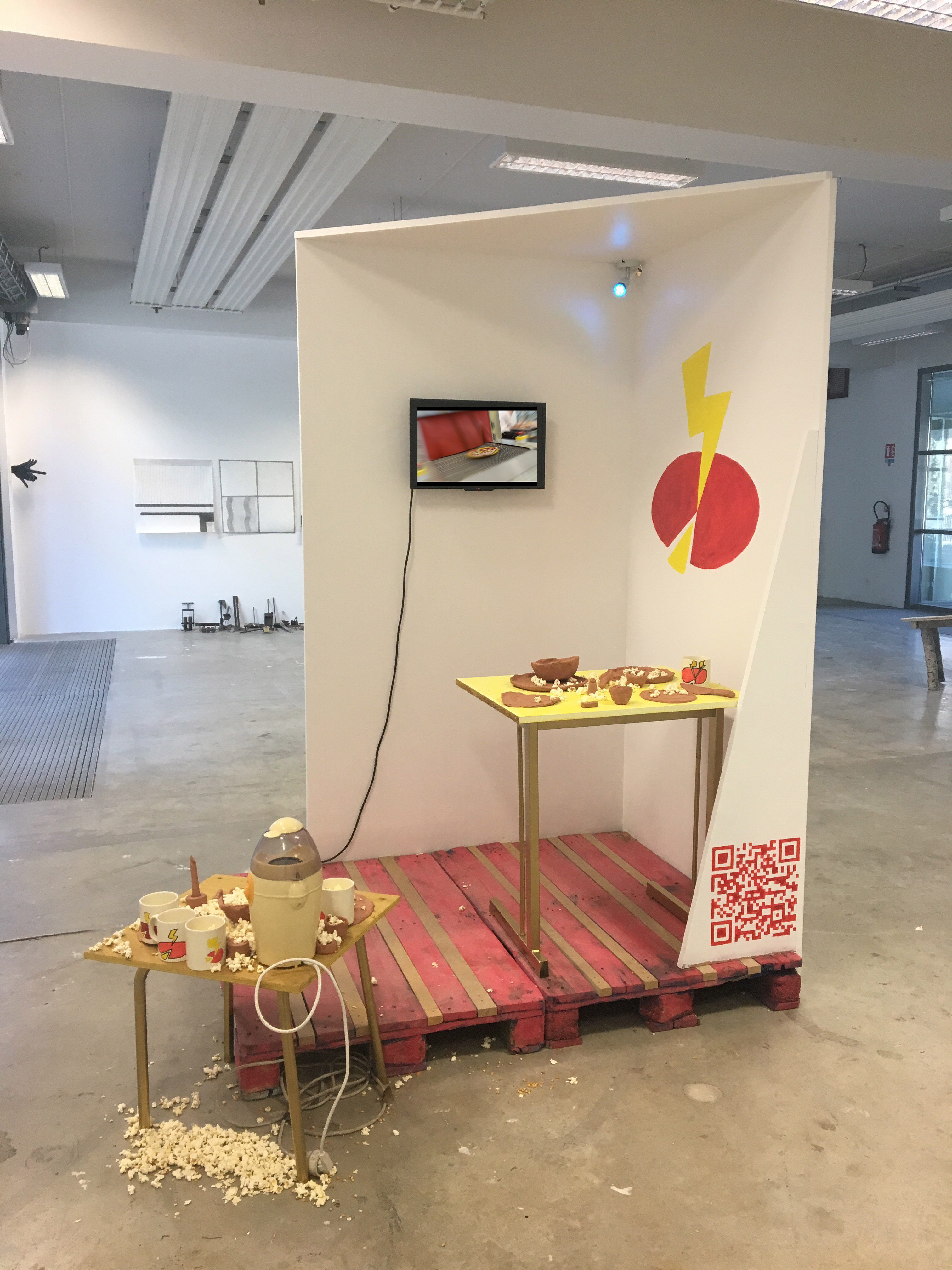 Logo et QR codes peints sur un stand en bois et palettes, 232 x 160 x 125 cm, deux tables en bois et métal doré à la bome, beaucoup de céramiques quasi-crues, cinq mugs avec le logo de l'entreprise peint à la main, une machine à pop corn, du popcorn, du maïs, le film d'entreprise sur télévision (3min40), une lampe de salle de bain